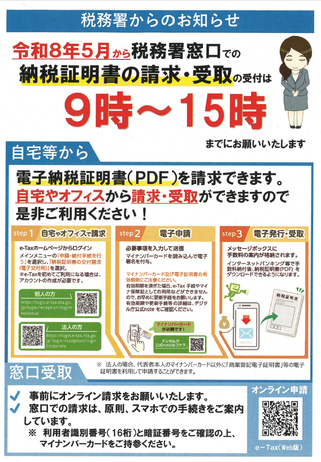 納税証明書の窓口受付時間が「9時~15時」に短縮されます。