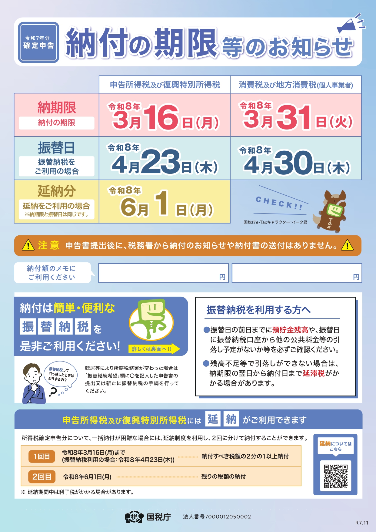 ・令和7年分確定申告納付の期限等のお知らせ
